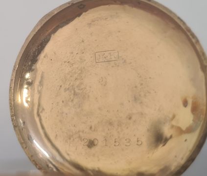 Gold open faced wristwatch, the case with engraved floral decoration, marked 14KCondition ReportInner dust cover not hallmarked.Winds but not running.Case Diameter Approx 3cm.Approx weight 28.4g