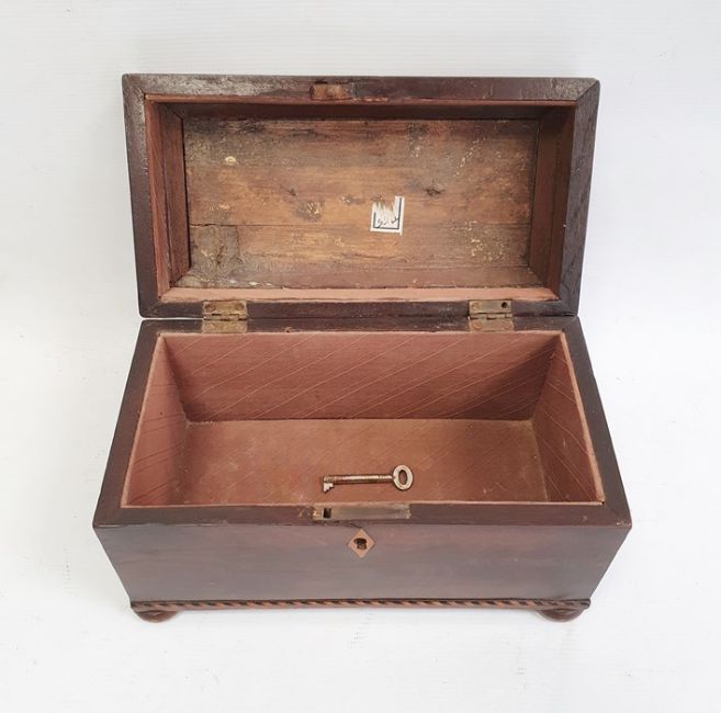 19th century mahogany tea caddy with ebony and boxwood stringing, the whole raised on squat bun feet, 23.5cm x 14cm