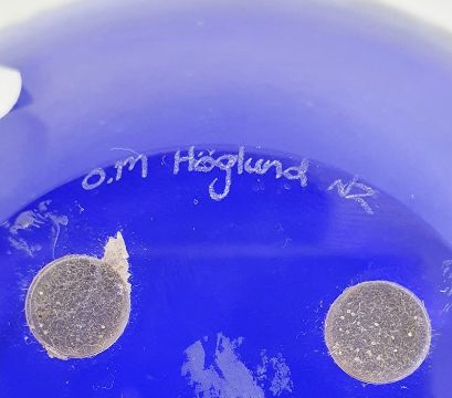 Hoglund (New Zealand) blue and clear cased glass bowl with acid etched signature to base and bears original label and two frosted glass globe paperweights (3)