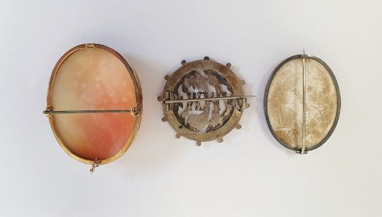 Gold-mounted shell cameo brooch depicting an artist and his wife, marked 9ct, 5cm long, a Victorian silver-coloured brooch with pierced 'Emma', and a pink ceramic brooch, stamped Ruskin (3)