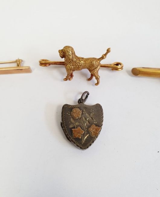 Victorian gold knot bar brooch, marked 15ct, approx. 3.2 g, gold bar brooch engraved 'Beth', marked 10ct, approx. 2g, a gold-coloured bar brooch surmounted by a model of a poodle, unmarked and a Victorian silver heart-shaped locket (4)