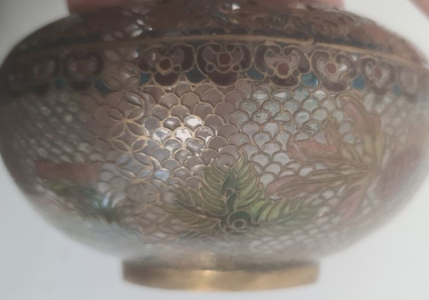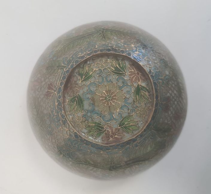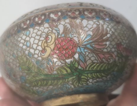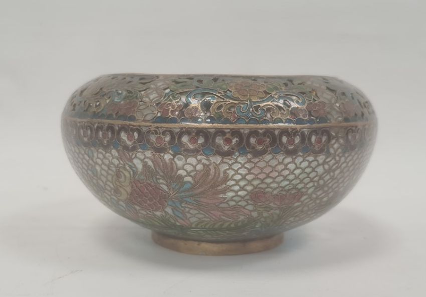 Japanese plique-a-jour enamel bowl with incurved rim, brass mounted and decorated with koi carp and foliage, probably first-half 20th century, 14cm diameter