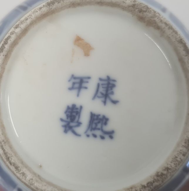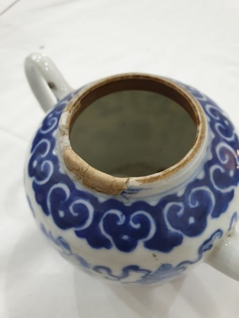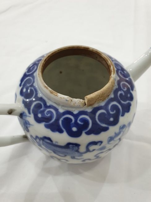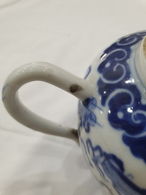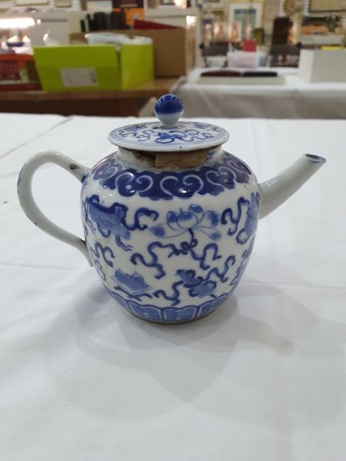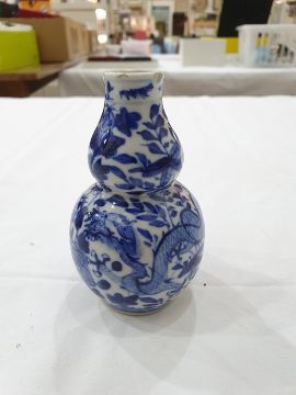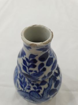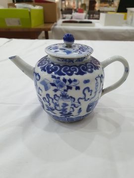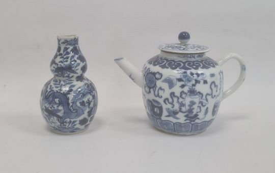 Chinese porcelain teapot, bulbous and decorated in blue with precious objects, 11cm high (repaired to neck), Kangxi four-character mark to base and a Chinese porcelain miniature double-gourd vase, 11cmCondition ReportTeapot has some light surface marks, accretions and staining.  Some small chips to glaze, the rim has some areas of loss and repair.The gourd vase has some light surface marks and some chips to the rim. See photos.
