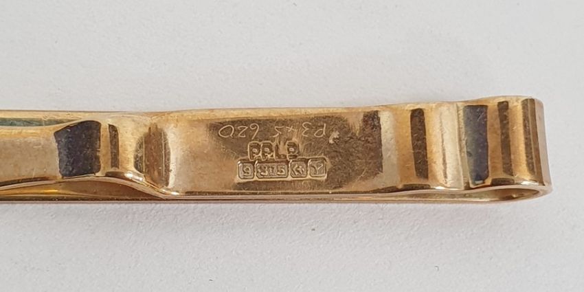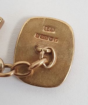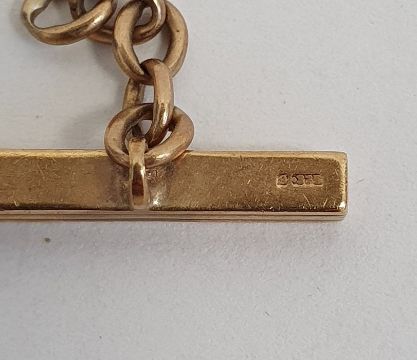 9ct gold tie clip of plain design, approx 4g, a single 9ct gold cufflink set with bloodstone and a chain (3) Condition ReportChain Marked 9ct, Approx. Weight 1.2g.Single cufflink + broken cufflink section weight 5.2g.