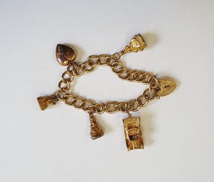 9ct gold charm bracelet, padlock clasp with five assorted charms including three fob seals, 43g in total approx.