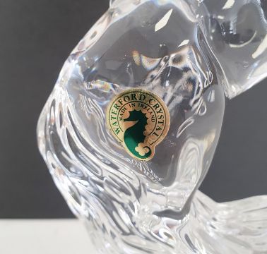 Waterford crystal model depicting a rearing horse, acid etched mark to base and retains original label, height approx, 24cm