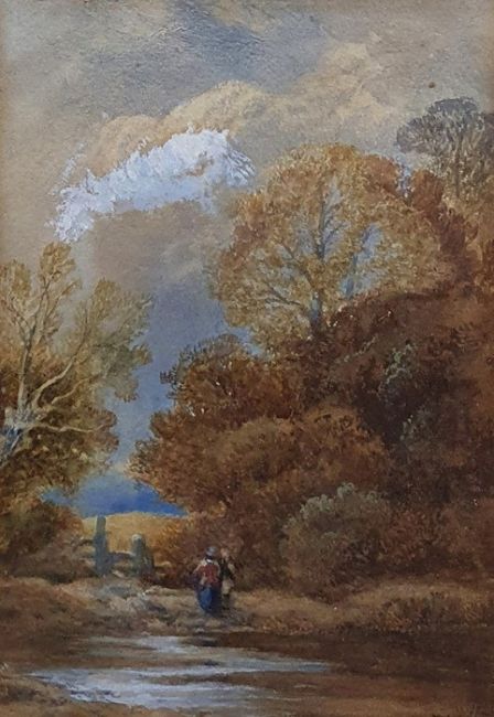 W. Hall - British School, late 19th/early 20th centuryWatercolourFigures in a landscape by a lake, signed lower right, 18 x 12cm andBritish School - 20th centuryWatercolourA mantelpiece clock and a mirror, with monogram SM and dated '89 lower right, 18 x 14 cm (2)