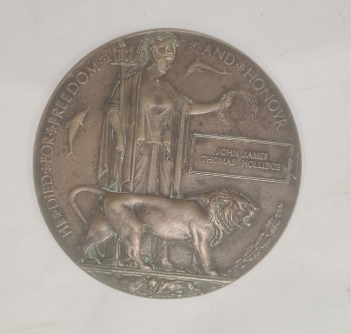 A WWI bronze death plaque for 'John James Thomas Hollidge'