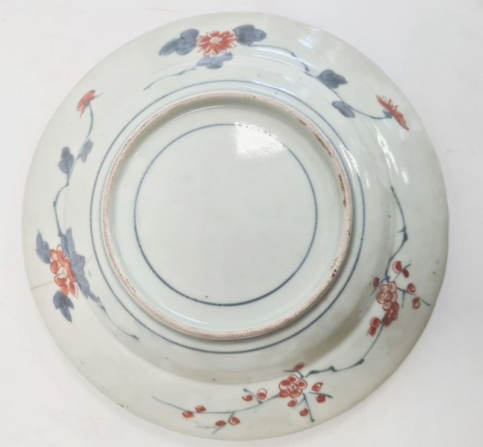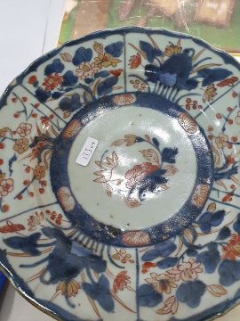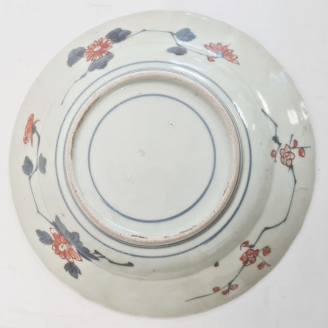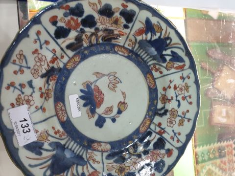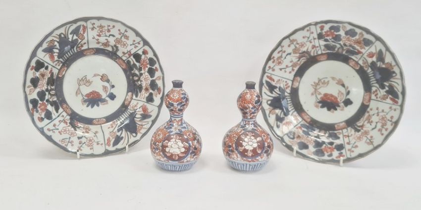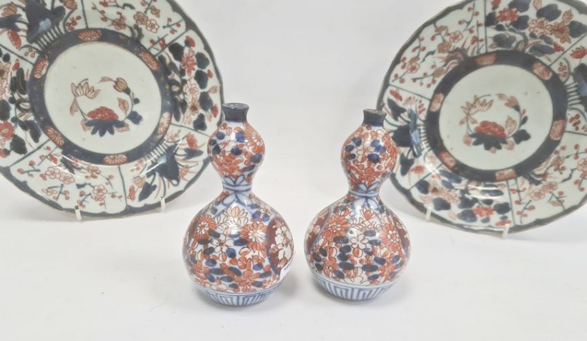 Pair Japanese Imari dishes with flowers in panels, 23cm dia. and a pair of porcelain double-gourd vases in Imari colours, 14cm highCondition ReportGilt throughout loss to both dishes. A few glazing imperfections. Crack to back of one.Minor wear, especially to base and a few glazing imperfection to vases.