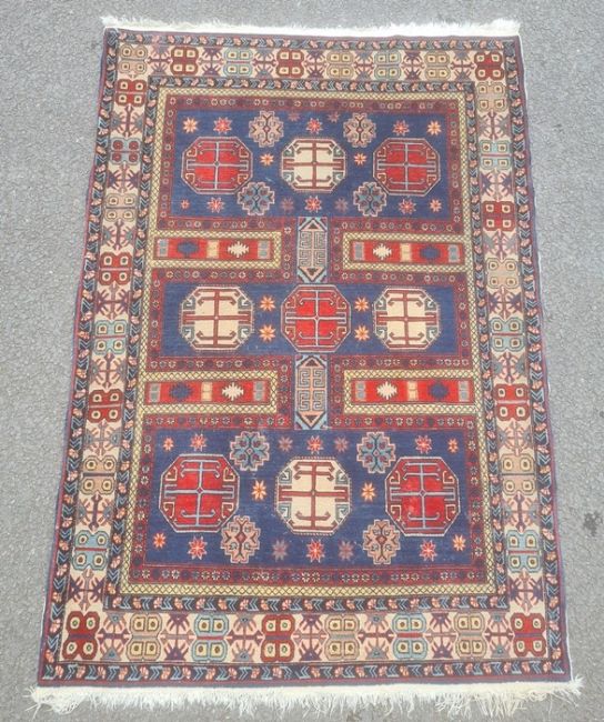 Modern Eastern-style rug, the blue ground field with nine octagonal motifs, in blues, reds, yellows and creams, 198cm x 136cm