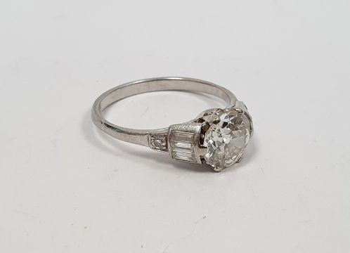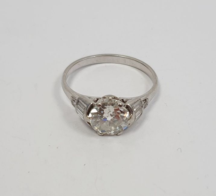 Solitaire diamond ring, the central brilliant cut diamond approx 1.4ct, the shoulders set with three graduated baguette-cut diamonds and a single eight-cut diamond on each side, finger size M 1/2 Condition ReportNo damage to central stone, no inclusions and is bright.  Diamond diameter average is approx 7.3mm and depth approx 4.3mm.  Age Possibly mid 20th century, we are unable to clarify colourthe metal has not been tested but is possibly white gold, platinum??