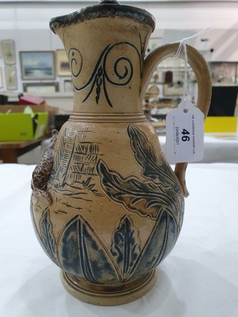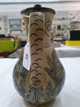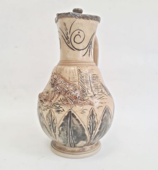 Hannah Barlow Doulton Lambeth salt glazed stoneware jug with silver hinged lid, sgraffito engraved and embossed with cat and kitten, monogram engraved to base, 23cm high Condition ReportGood condition.  Some light surface marks and accretions. Some tarnishing to the silver.