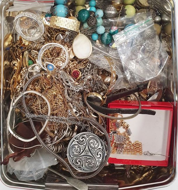 Quantity of assorted costume jewellery including gilt metal chains, brooches, pendants, etc