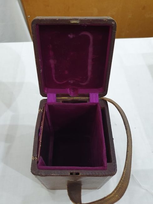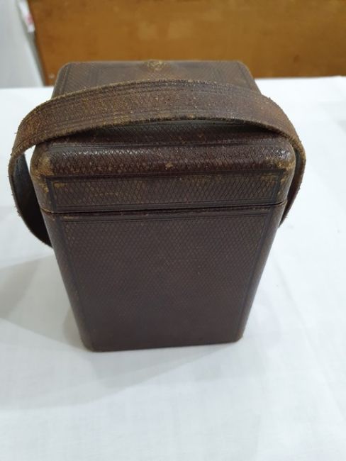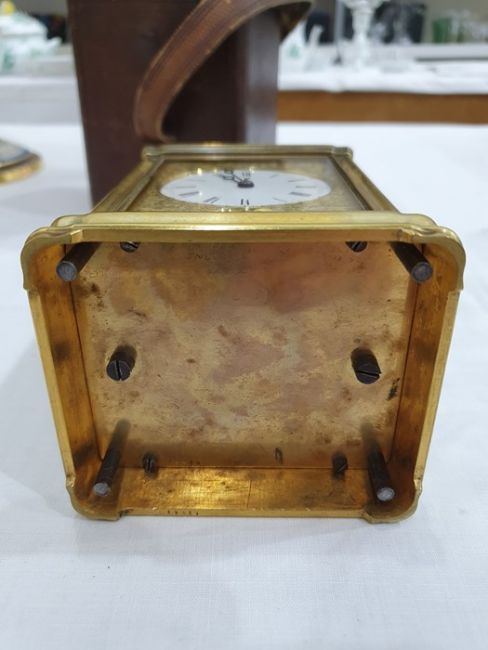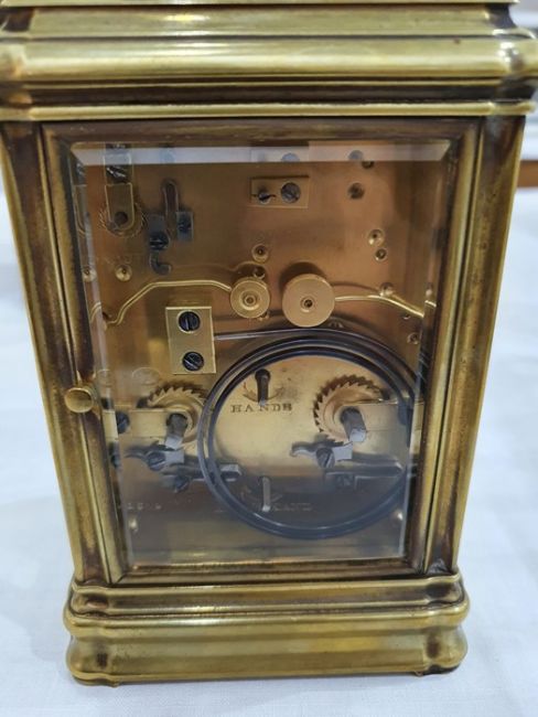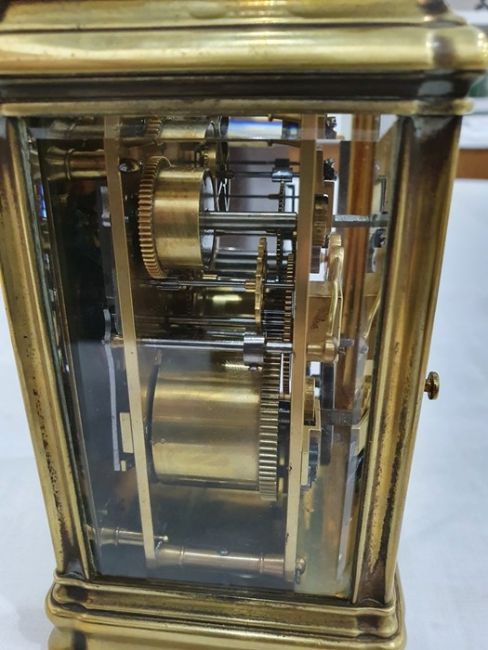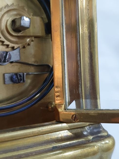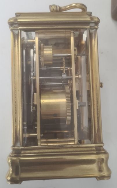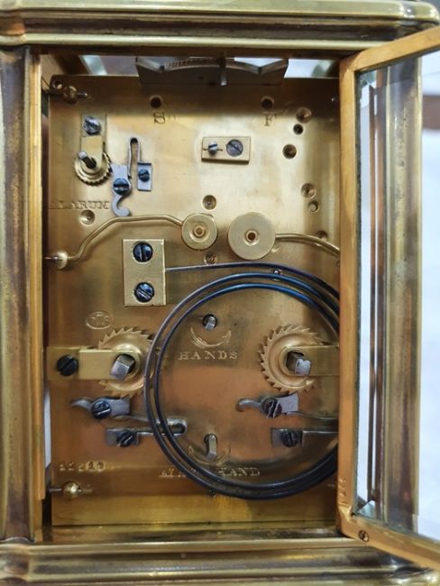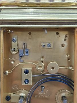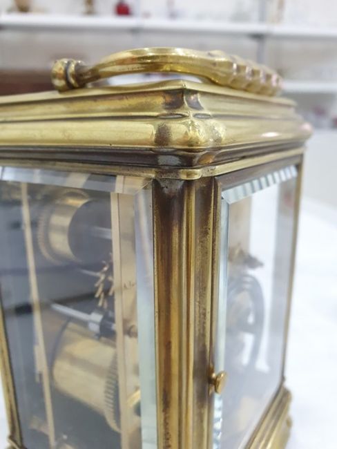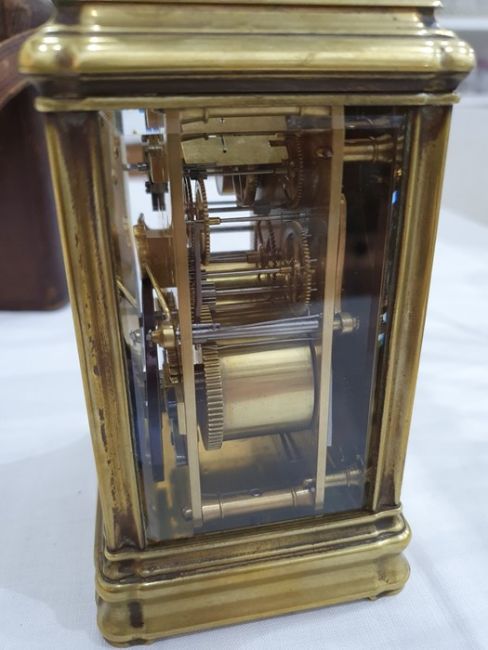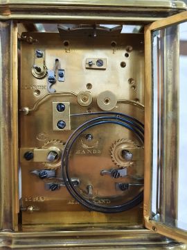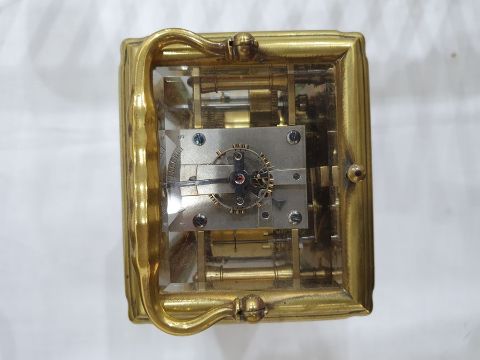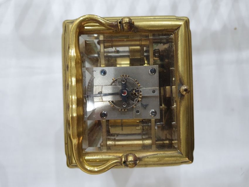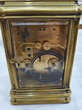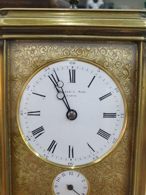 Miller & Sons of Paris carriage clock with Roman numerals to the enamel dial, with subsidiary alarm dial, foliate engraved plate, five-sided glass and brass case, numbered 12513 to the back, all housed in brown leather travel case, 17cms to the top of the handle Condition ReportSome light surface scratches and scuffs to both glass and brass. Tarnishing and wear to areas of brass.  Leather case has scratches, scuffs and knocks.Is just repeater clock, less frequent that quarter hour.  17 cm to the top of the handle.
