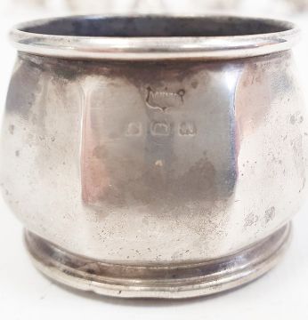 Silver salt by Mappin & Webb, Birmingham 1925 and a matching mustard pot and cover, both of panelled form, two other silver mustard pots, the silver mounts for a hip flask (glass missing), a white metal naturalistic part chamberstick modelled as a flower (unmarked) and various other items