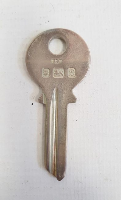 Victorian silver rattle, Birmingham 1893, with floral scrolling decoration with integral whistle and hung with bells, 13cm long, a silver model of a Yale-style key, a Victorian caddy spoon, Exeter 1877, a model of a Mercer 1913 car marked 800 and various other items