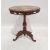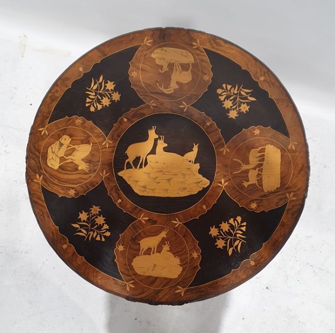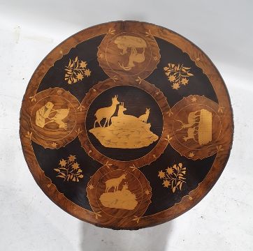 African-style walnut and marquetry inlaid centre table, the top inset with various African and other animals and flowers, carved and pierced frieze, carved and turned column to ogee feet, 57cm diameter