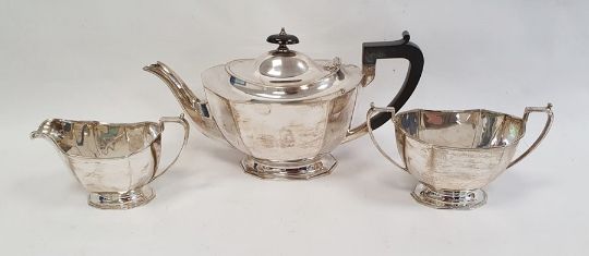 Silver three-piece tea set by Frank Cobb & Co Ltd, Sheffield 1939, comprising teapot, two-handled sugar bowl and milk jug, all of panelled form with engraved monogram, approx total weight 29oz (3)