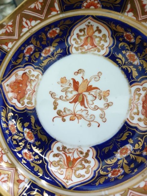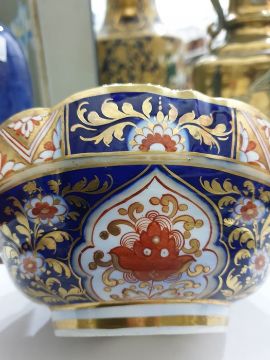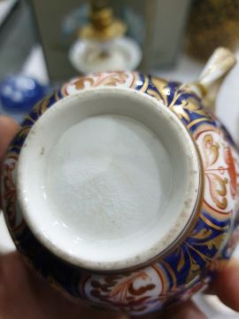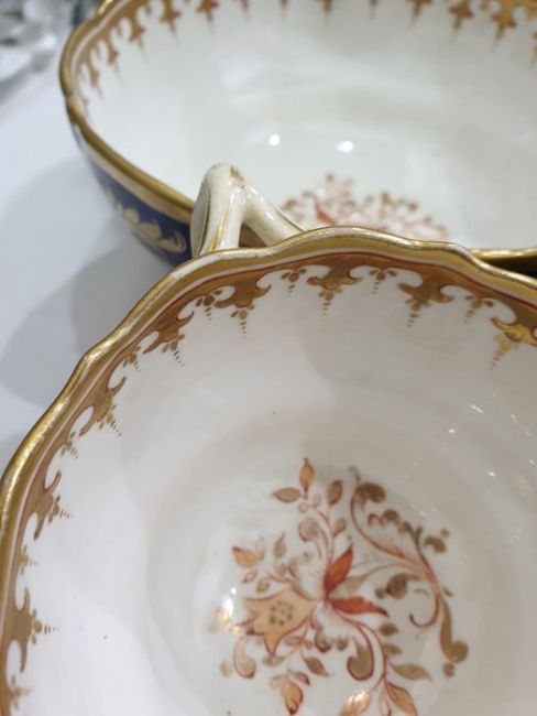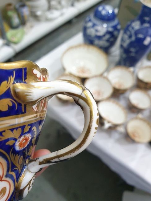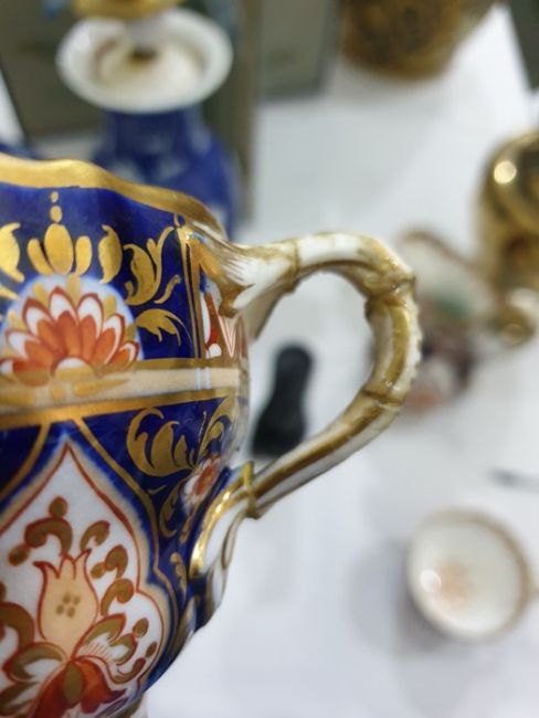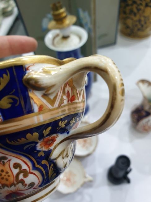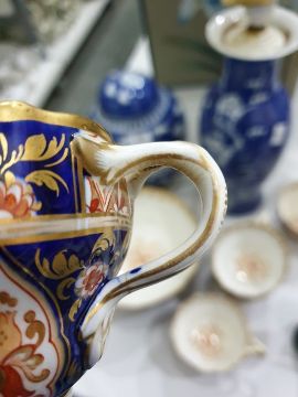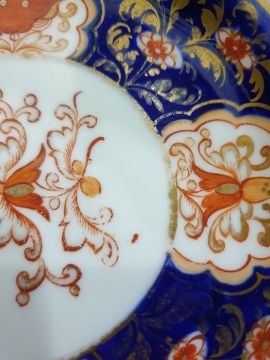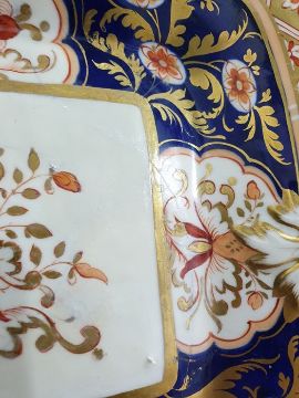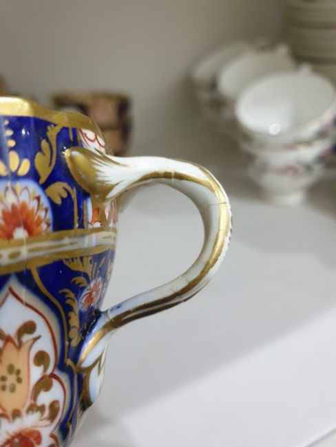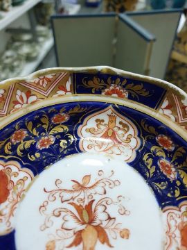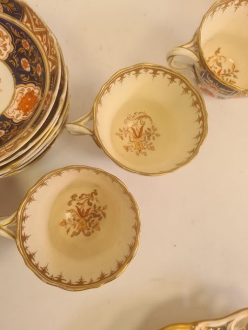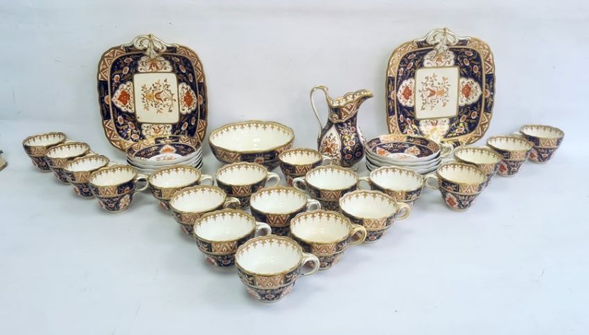English porcelain Imari pattern part tea service of fluted form, 1820's, printed and painted in gilt with shaped panels, scrolling flowers and leafy tendrils alternating with dark blue panels, gilt with leaves and iron red flowerheads viz;: a baluster milk jug, a slop bowl, two shaped square dishes with pierced scroll handles, ten teacups, nine coffee cups, twelve saucersCondition ReportMost have some wear to the base.Most have some black marks, most noticeably on bowl.Some crazing throughout only very minor on cups and saucers.Teacups- 2 Handles well repaired, 2 moderately well repaired and 1 poorly repaired. Some discoloration on 2 handles. Staining noticeable inside 3 cups. Some minor loss gilding throughout. Saucers- Some loss of gilding and minor scratches throughout, 2 with moderate colour loss at the centre. 1 Has a chip on its base.Both plates have old repairs and some gilt loss, one has a chip.