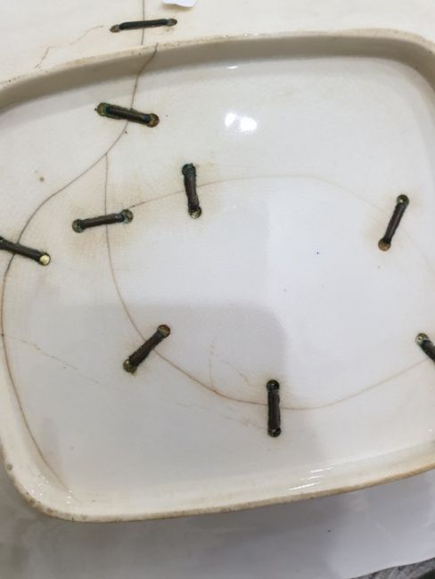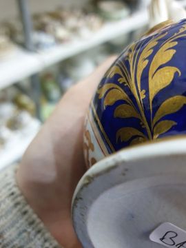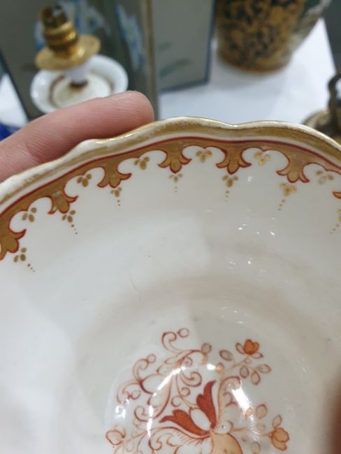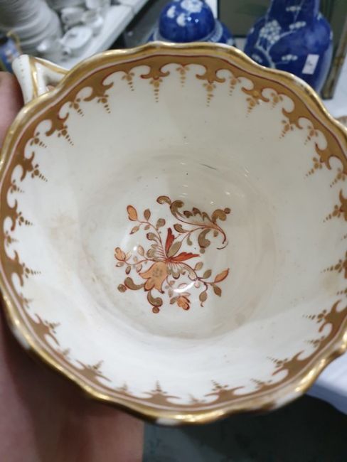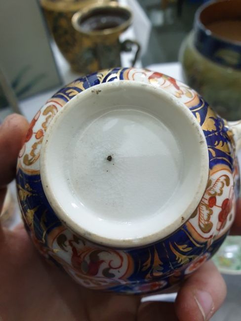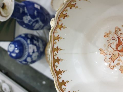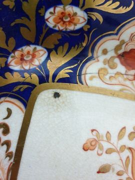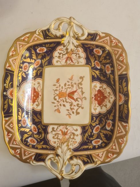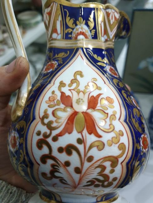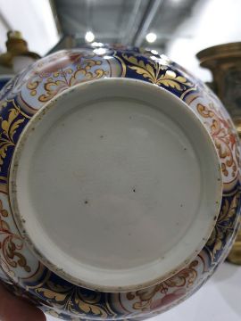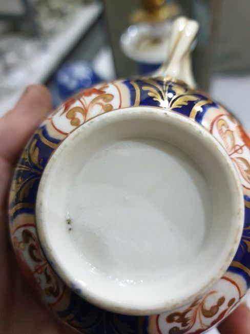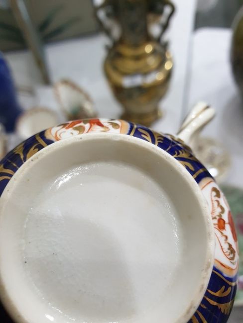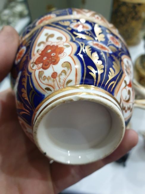English porcelain Imari pattern part tea service of fluted form, 1820's, printed and painted in gilt with shaped panels, scrolling flowers and leafy tendrils alternating with dark blue panels, gilt with leaves and iron red flowerheads viz;: a baluster milk jug, a slop bowl, two shaped square dishes with pierced scroll handles, ten teacups, nine coffee cups, twelve saucersCondition ReportMost have some wear to the base.Most have some black marks, most noticeably on bowl.Some crazing throughout only very minor on cups and saucers.Teacups- 2 Handles well repaired, 2 moderately well repaired and 1 poorly repaired. Some discoloration on 2 handles. Staining noticeable inside 3 cups. Some minor loss gilding throughout. Saucers- Some loss of gilding and minor scratches throughout, 2 with moderate colour loss at the centre. 1 Has a chip on its base.Both plates have old repairs and some gilt loss, one has a chip.
