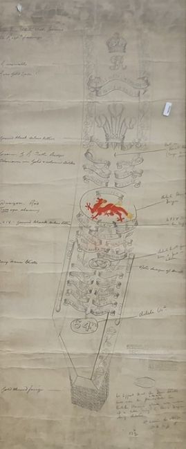 George Potter & Coy - 20th centuryPencilPair of designs for military sashes for the 1st Bn the North Staffordshire Reg and the Black Watch Royal Highlanders 2nd Bn with pencil annotations, 87 x 36m (George Potter & Coy were military musical instrument makers in Aldershot)