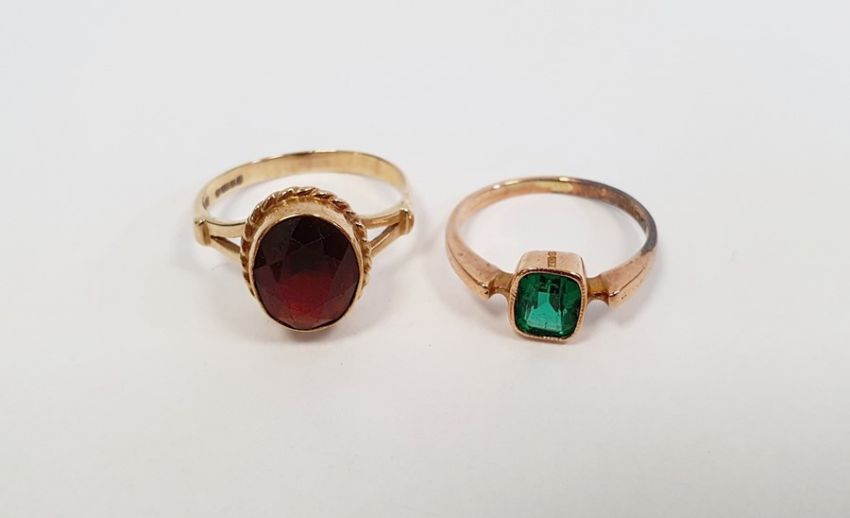 9ct gold single stone ring, set with an oval red stone, fingersize N, and a gold-coloured single stone ring, set with green paste, fingersize J, total weight approx. 4.6g (2)