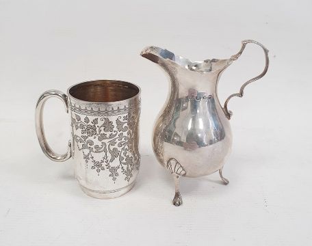 Victorian silver cream jug, Birmingham 1896 of baluster form with wavy rim, scroll handle, on three feet, 11cm high and a silver mug by Henry Atkin, Sheffield 1900 of plain circular form with engraved scrolling floral decoration, 8cm high, 7oz total weight approx (2)