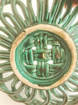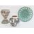 Incised stoneware vase with metal mounts, probably Doulton stoneware, a green pottery pierced basket and a Danish pottery vase with abstract blue floral decoration, 17cm high