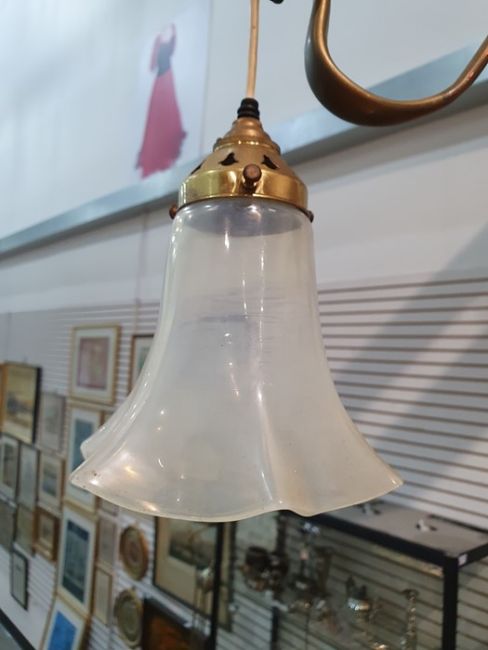 20th century three-branch electrolier with vaseline glass shades, brass bodyCondition ReportSome surface scratches, accretions to both glass shades and brass.  Some tarnishing to the brass.