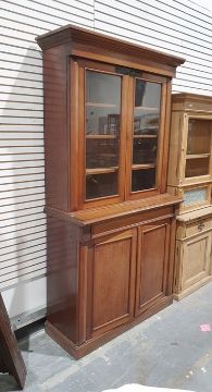 Late 19th century mahogany bookcase cabinet, the moulded cornice above two glazed doors enclosing shelves, the base of single drawer and two cupboard doors to plinth, 115cm x 220cm