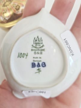 Royal Crown Derby small box and cover of oval form decorated in the 'Old Imari' pattern, 7cm long, a Danish Bing & Grondahl pin dish modelled as a leaf and a Royal Crown Derby jug in the Derby Posies pattern (3)