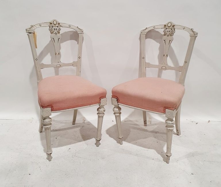 Pair of painted side chairs with pink upholstered seats, turned and fluted front legs to peg feet (2)
