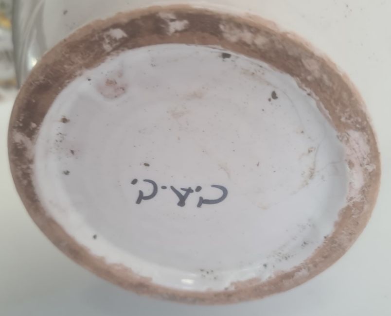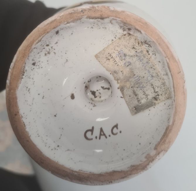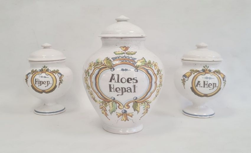 Italian maiolica large drug jar inscribed 'Aloes Hepat' and another pair of pedestal inscribed 'Hipep.' and 'A.Mep' (3) Condition ReportLarger Jar Height Approx. 27cmSmaller Jars Height Approx 20cm