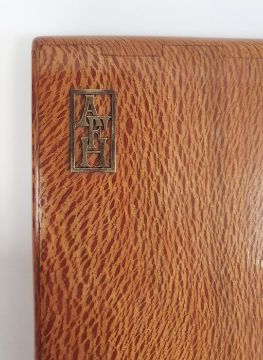Early 20th century tiger beech wooden cigarette case in the style of Faberge, of rectangular form, the hinged cover with applied gold-coloured monogram 'AFH', coincidentally August Frederik Hollming initials, 11cm x 8cm