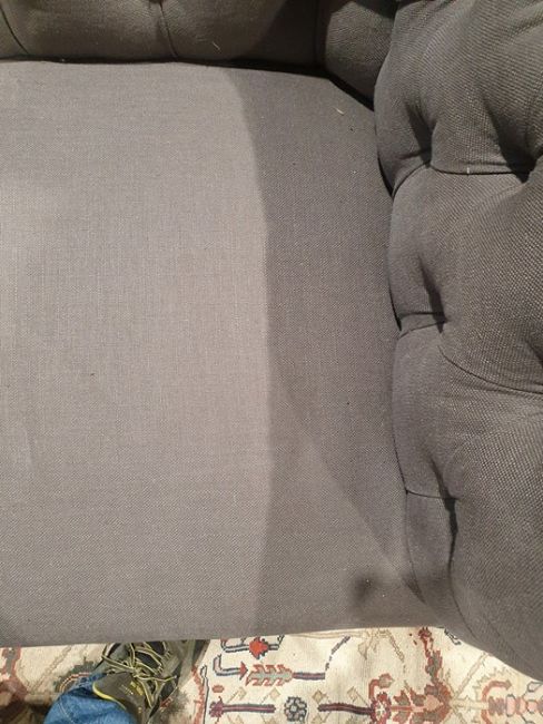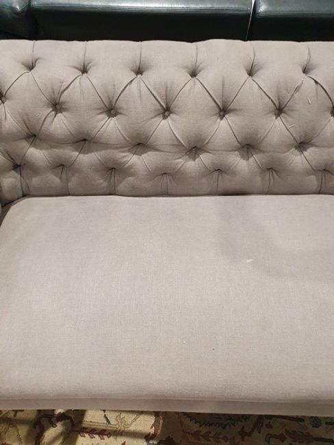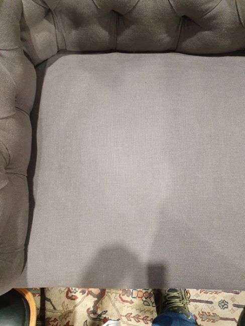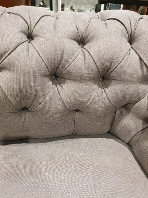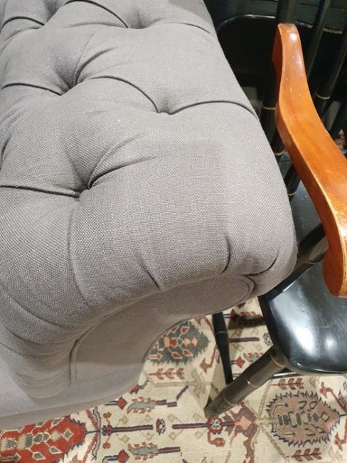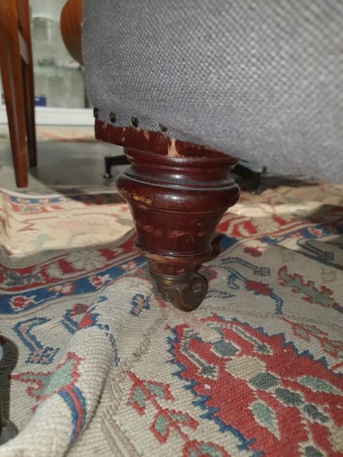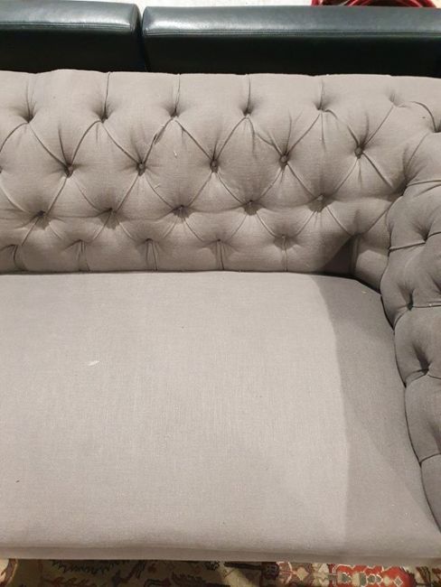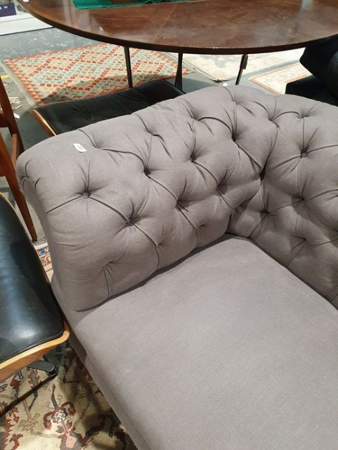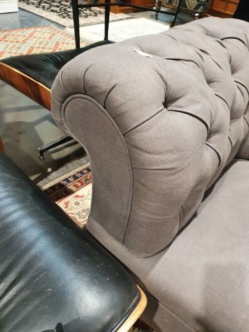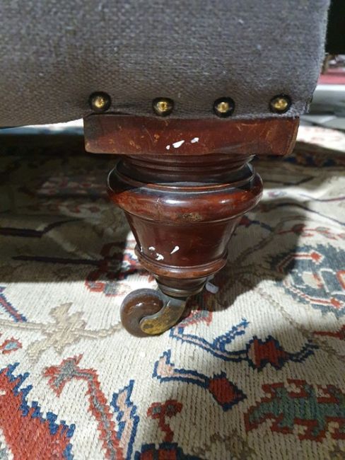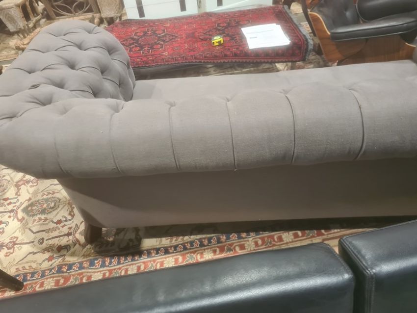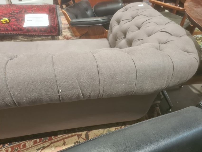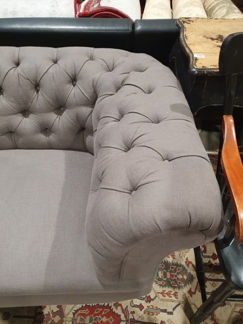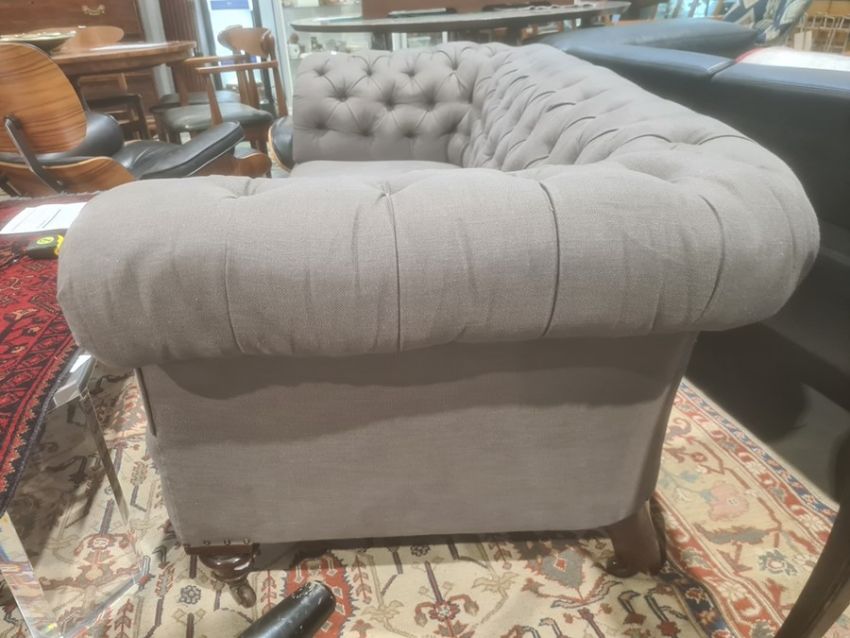 Late Victorian Chesterfield sofa in grey button back upholstery, on turned front legs to brown china castorsCondition ReportMinimal wear, possibly some fading, scuffs to wooden legs. See photos springs not too bad, dimensions 80 d x 70 h x 200 w