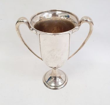 An early 20th century sterling silver two-handled trophy cup, inscribed 'Lt. Col. George W. Gatchell July 28, 1912 from officers of the first district C.A.C. R.J.N.G in hearty appreciation of their instructor', marked sterling 224 to base, 24.5cm high, 13.5ozt approx.