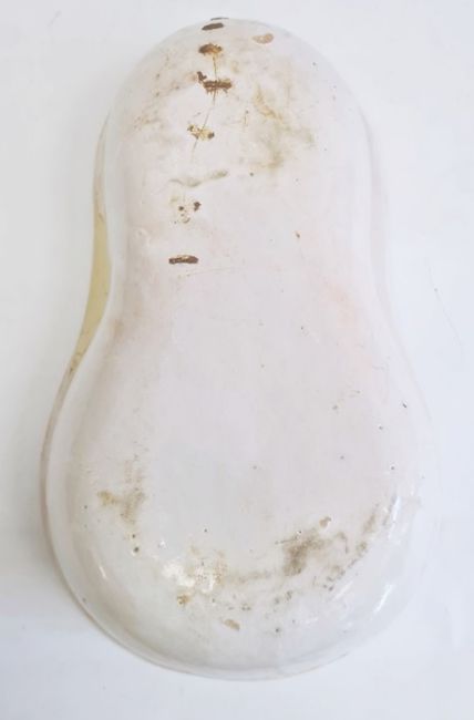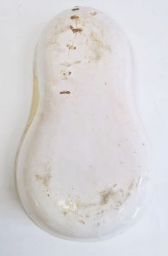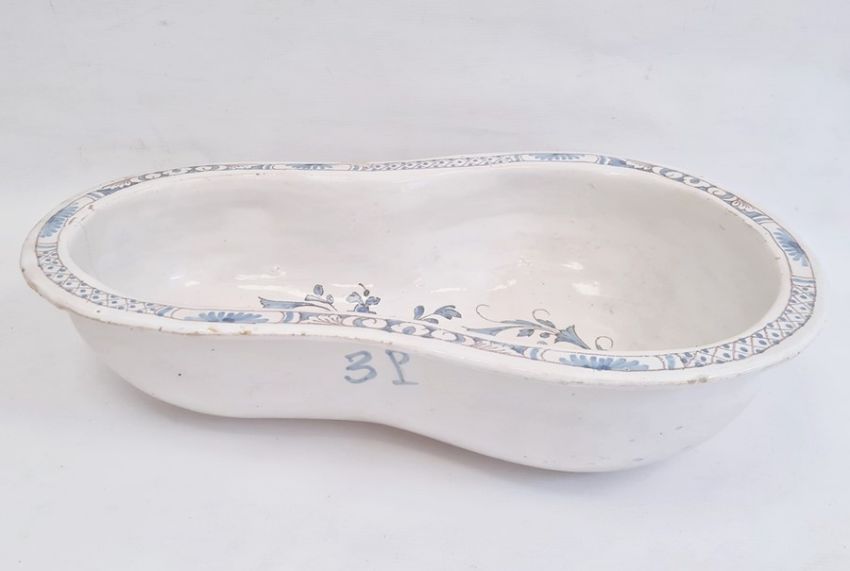 Nineteenth century tin-glazed earthenware bidet bowl in blue and white with floral scrolling decoration to the centre, trellis and foliate border, 46cm long (with crack and staples)