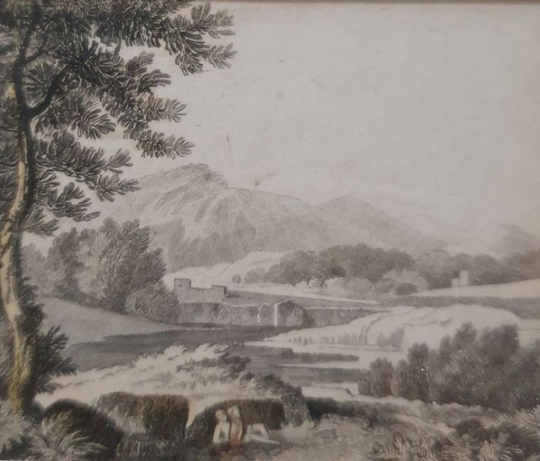After PoussinPair small engravings Landscape scenes, 5 x 6cm and 4 x 6cm and Modern print of a plant and a pair of Baxter prints of figures on horseback (5)