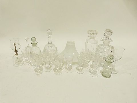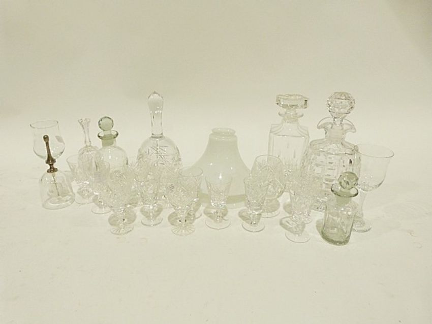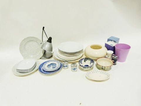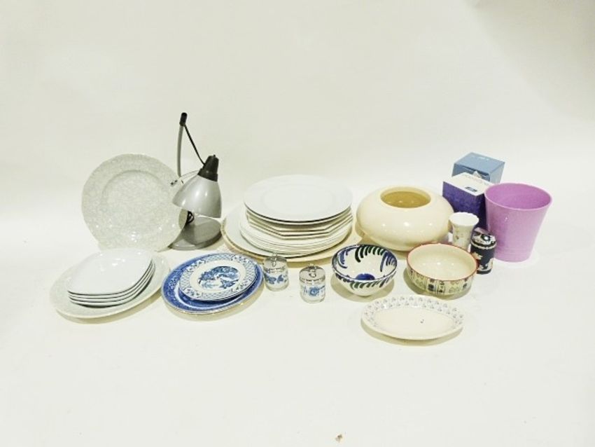 Glass decanter, two wire ceiling light frames, a basket of assorted items, various crockery and glassware (4 boxes)