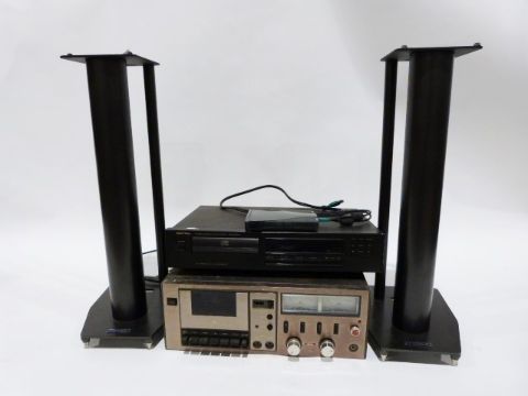 Rotel DVD player and a Teac stereo cassette deck and a pair of speaker stands