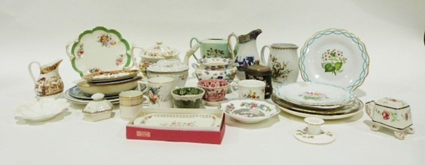 Assorted ceramics including an ironstone jug, an early Victorian teapot, a Wedgwood jug, etc. (2 boxes)