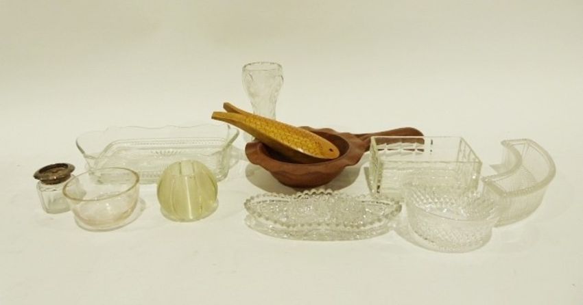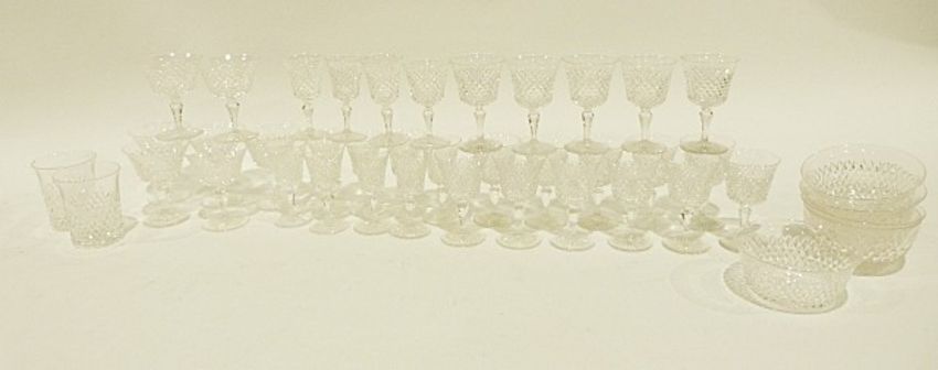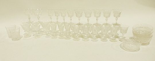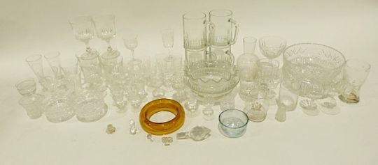 Assorted glassware including a suite of drinking glasses,19th century tumblers, an etched water carafe, vases, jugs, etc. (4 boxes)