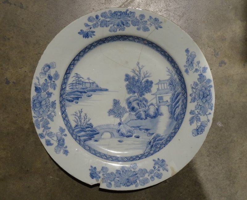 Chinese porcelain plaque, underglaze blue lakeside landscape painted decoration, 36 cm diam ( cracked)