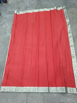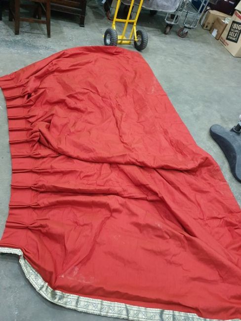Red silk blind with gold coloured thread border, approx. 182cm wide and a matching curtain