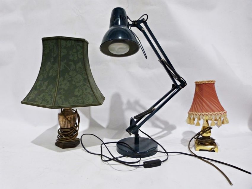 Black anglepoise lamp, a brass coloured small table lamp and a small silver-coloured metal table lamp and a shade (one shelf)
