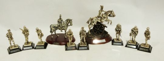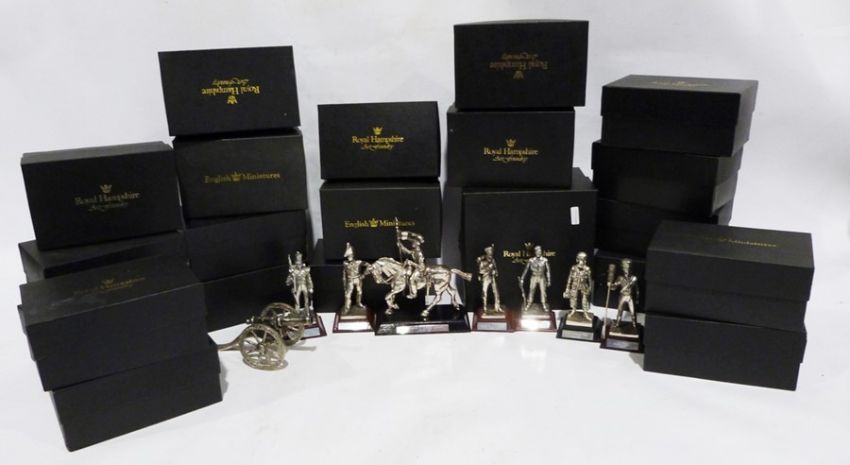 Quantity of Royal Hampshire Art Foundry silver coloured metal figures of assorted regiments and soldiers, eg. Wellington at Waterloo (not boxed). Royal Artillery sergeant from the Gulf in 1991, Royal Navy Captain Gulf 1991, The Charge of the Light Brigade a model (2 boxes with the boxes)