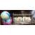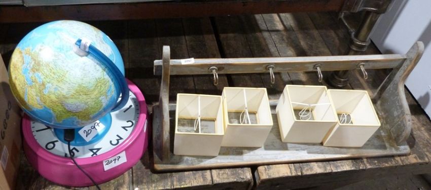 Box of hanging parasols weight set x 4 (unused in original plastic casing), a light-up globe, a shocking pink wall clock, a hanging shelf, coat rack, four lampshades for candle lamps