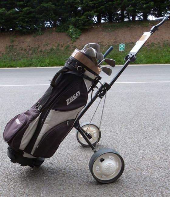 Golf clubs within a golf caddy on wheels and the golf clubs seem to be mainly by Tanaka
