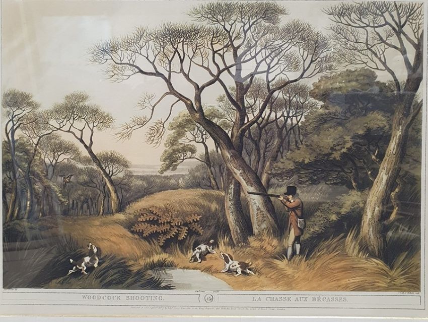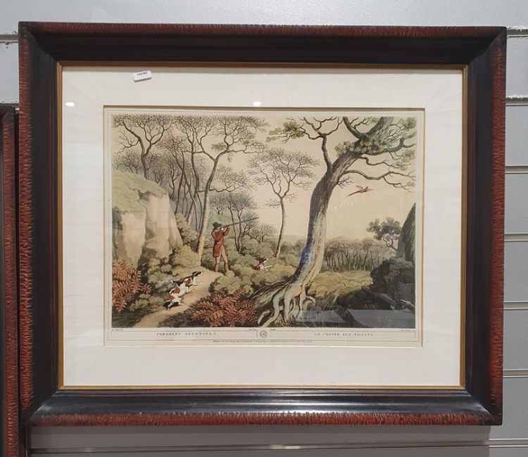 Pheasant shooting, partridge shooting, woodcock shooting and foxhunting, 57 x 67cm to include the frame, distressed wood with a gilt slip (4)