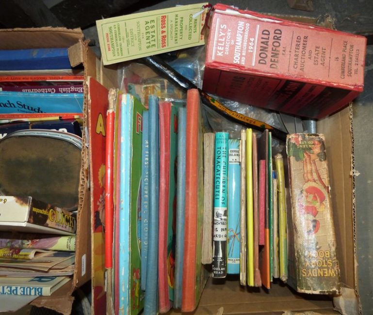 Quantity of children's books to include Jack and Jill Book 1957, A Look with Mother Book, Pets, Toyland Picture Book, Blue Peter Annual, paperbacks, few collectables, Contack game, Kan-U-Go, and Kelly's Directory of Southampton and Neighbourhood 1964, some wooden blocks, etc. (2 boxes)